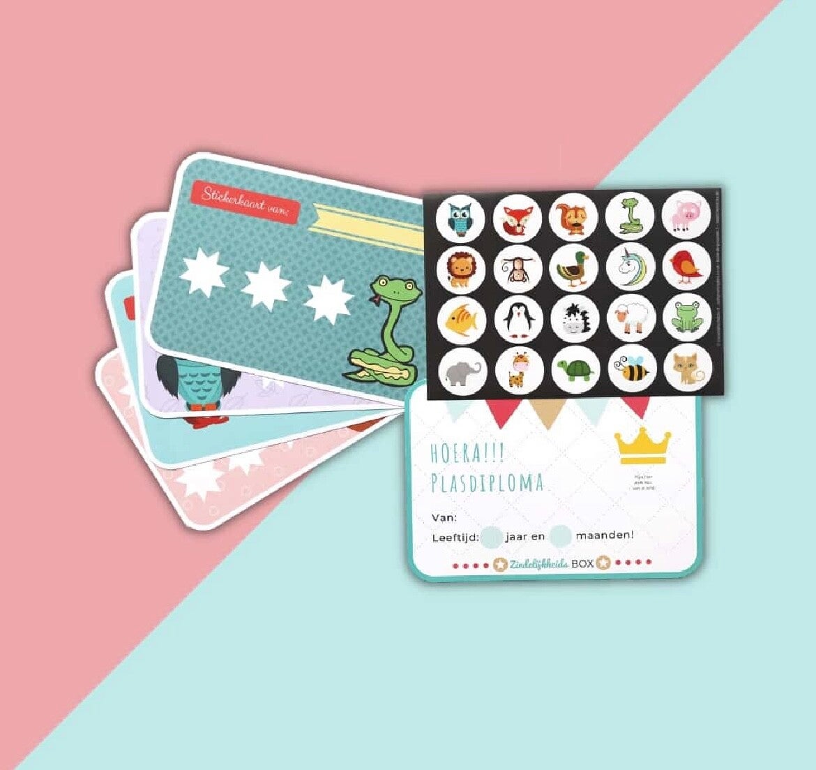 Het trainingsprogrammaboekje bevat instructies en veelgestelde vragen met antwoorden. De instructiekaartengeven je beknopte instructies per dag als herinnering. De complimentkaarten gebruik je als je even door je complimentjes heen bent. En met de zindelijkheidschema’s leer je de momenten kennen waarop jouw kind naar het toilet moet, zodat je de succeskans vergroot. Met stickerkaarten variërend van drie tot negen vakjes weet je wanneer, en kun je de beloningsfrequentie verlagen op het moment dat jouw kind daaraan toe is. Natuurlijk bevat de box ook vrolijke dierenstickers om te plakken, wanneer je kind een succeservaring heeft.